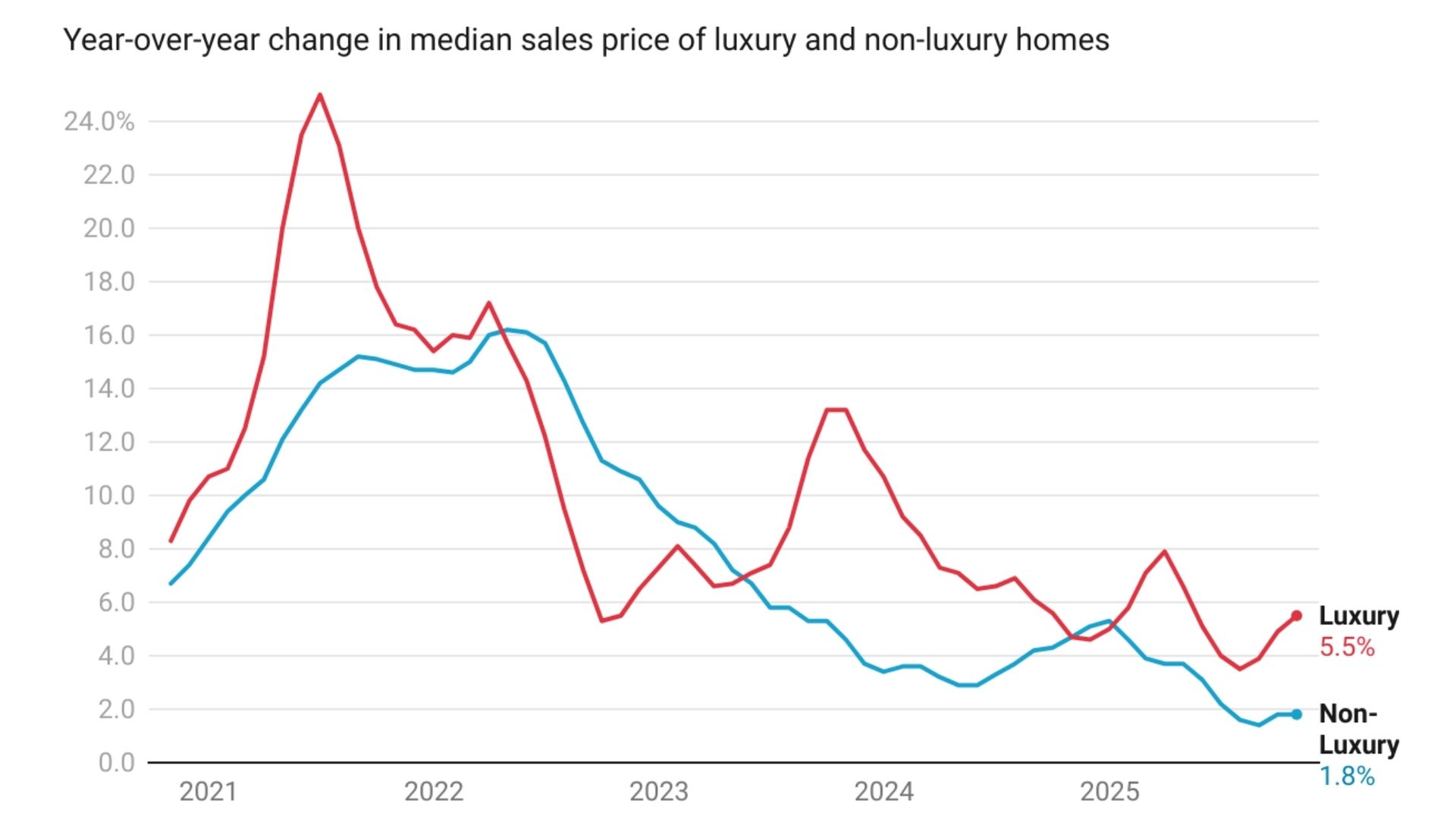Luxury housing continued to outperform the broader market in October, with prices up 5.5% — nearly triple the growth of non-luxury homes, according to Redfin. Strong equity markets and cash-heavy buyers are keeping high-end demand resilient, even as typical buyers remain constrained by current mortgage rates. Additional findings: